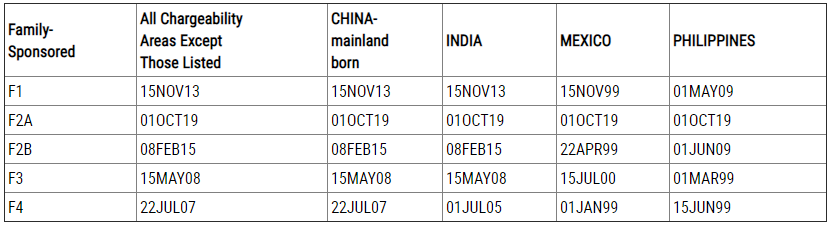 F2A:表A继续无排期,12月申请的申请人可以同时递交I-130、I-485表格,表B前进31天来到2019年10月1日。