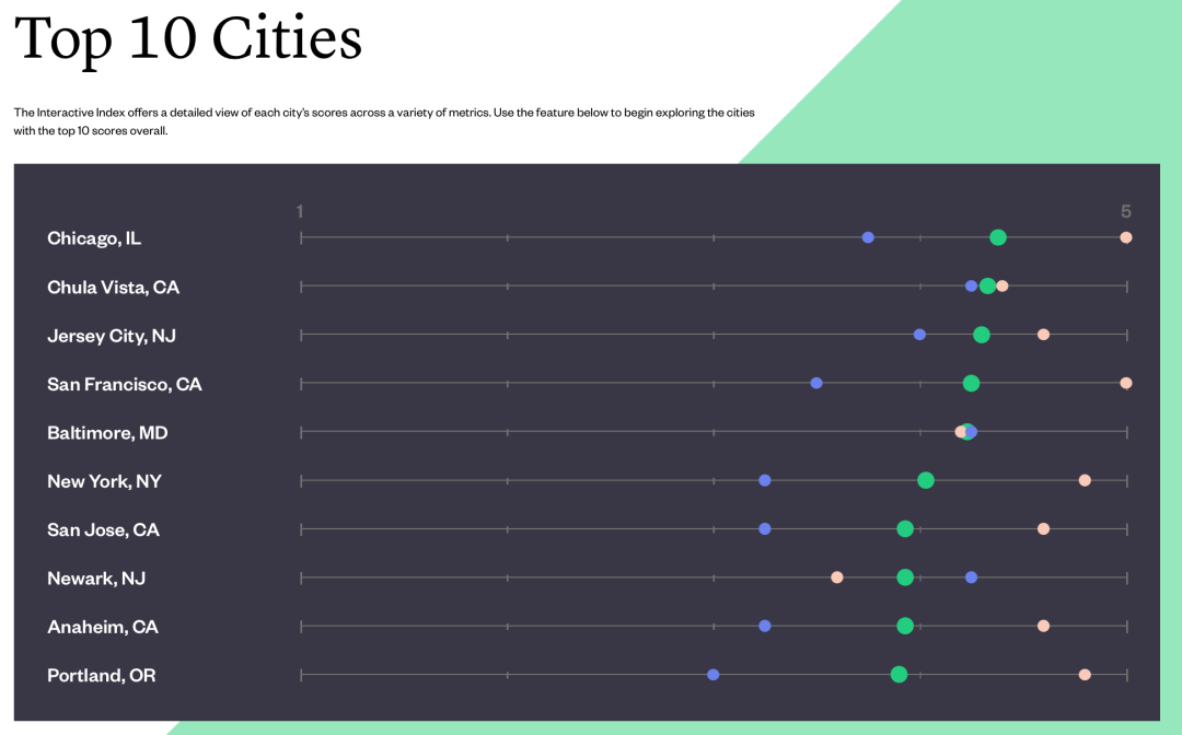 2019年排名前五的城市,依序分别为芝加哥、加州圣地亚哥的朱拉维斯塔(Chula Vista)、新泽西市、旧金山、巴尔的摩,2018年芝加哥仅排名第八,今年大幅前进到第一。