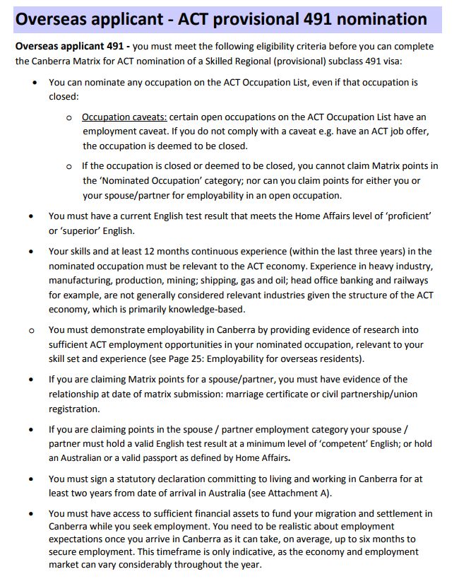 3. 在递交Matrix时,等待获邀时,或者获邀时,主副申请人必须在海外。(如果申请人的配偶或子女在递交Matrix前12个月,曾在澳洲其他州或领地居住及工作,则申请人不具有申请ACT 190州担保的资格。)