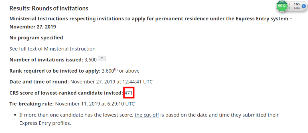 11月27日,加拿大移民局于官网更新联邦EE项目第131轮邀请信息,本轮共发放3600个邀请,与上一轮邀请持平;最低获邀分数为471分,较上一轮降低一分。